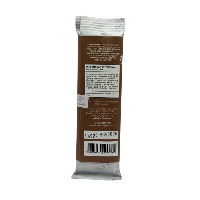 Cacau, açúcar cristal orgânico, manteiga de cacau e leite em pó integral.