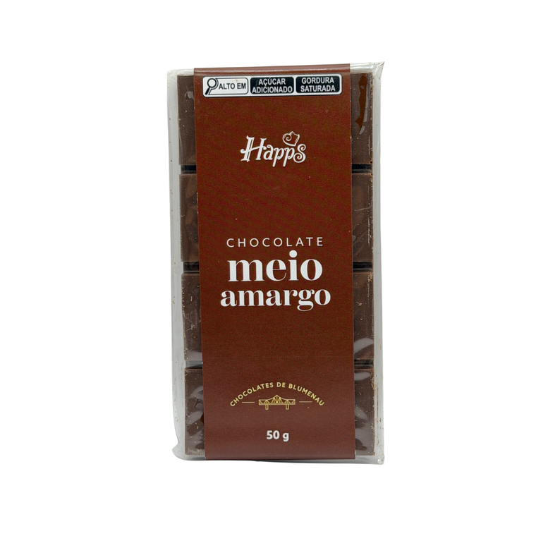 Chocolate meio amargo artesanal da Happs, feito em Blumenau, com sabor intenso, textura macia e perfil aromático equilibrado. Ideal para quem busca chocolate de verdade.